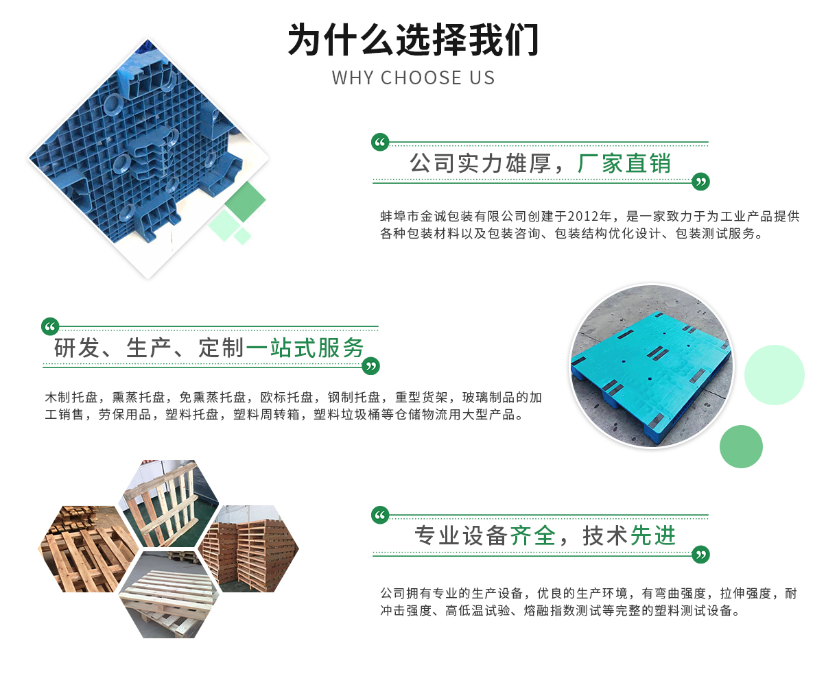 蚌埠市金誠包裝有限公司創(chuàng)建于2012年,是一家致力于為工業(yè)產(chǎn)品提供各種包裝材料以及包裝咨詢、包裝結(jié)構優(yōu)化設計、包裝測試其中包括木制托盤,熏蒸托盤,免熏蒸托盤,歐標托盤,鋼制托盤,重型貨架,玻璃制品的加工銷售,勞保用品...